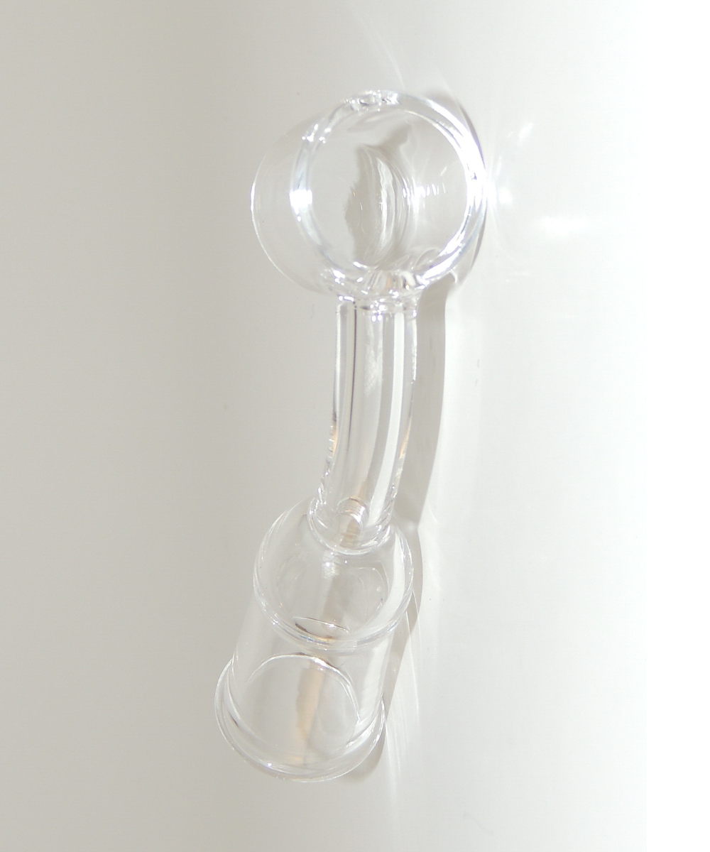 This banger is made by Gear. The quartz banger has a 14mm female fitting and sits at a 45° angle. The quartz bucket is flat with an angled top. Quartz bangers for dabbing work best with the use of a butane torch and carb cap.
