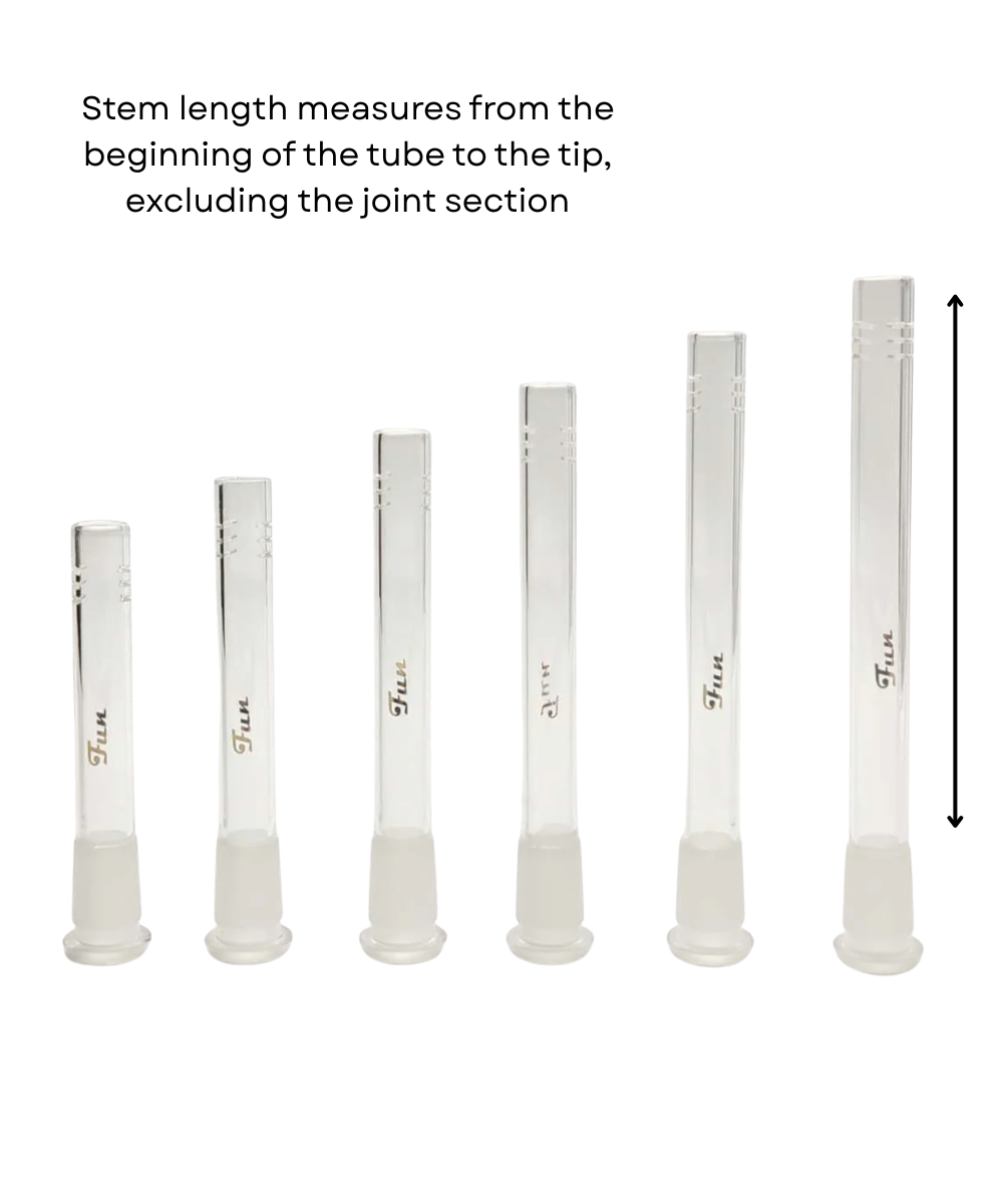 STEM LENGTH measures from the beginning of the tube to the tip, excluding the joint section.This diffuser downstem has 6 horizontal slits with 14/14 fitting that is fully compatible with bongs, beakers, bubbler or straight tubes featuring 14mm joints. Various downstem lengths available.