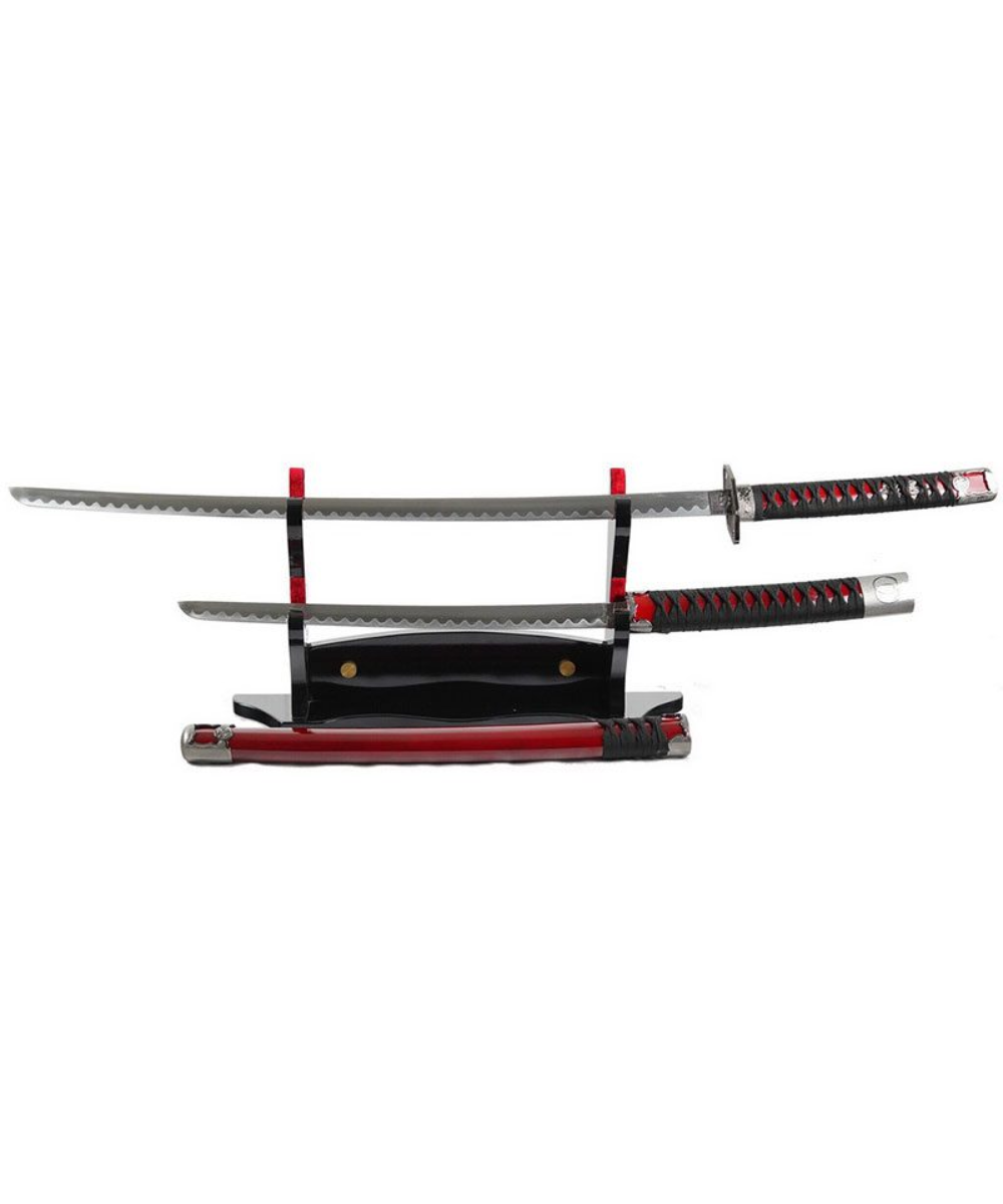 Embrace the spirit of the samurai with this stunning 42-inch Samurai Sword Combo, complete with a matching Wakizashi, both elegantly housed in a single scabbard. Each sword features a razor-sharp stainless steel blade, detailed tsuba guard, and a traditional wrapped handle for an authentic aesthetic and comfortable grip. The scabbard showcases ornate detailing, making this set perfect for collectors, martial arts enthusiasts, or as an impressive display piece.