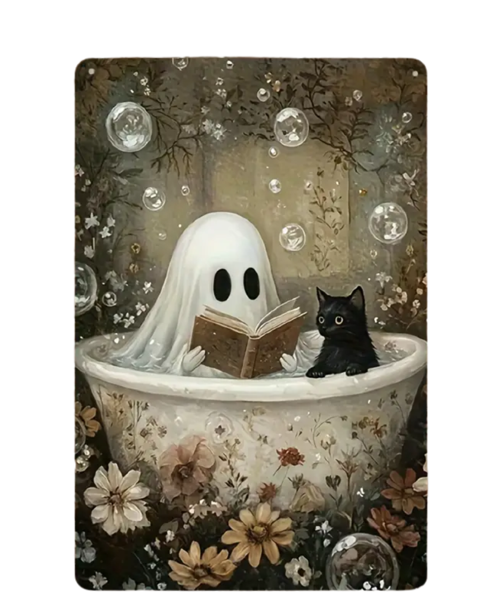 Add a touch of spooky charm and humor to your space with the Ghost & Cat In Bathtub Tin Sign. This playful design features a cute ghost and cat enjoying a relaxing bath, perfectly blending creepy and adorable vibes. Made from durable tin with a vintage finish, it’s lightweight, easy to hang, and perfect for bathrooms, guest spaces, or Halloween-themed decor.