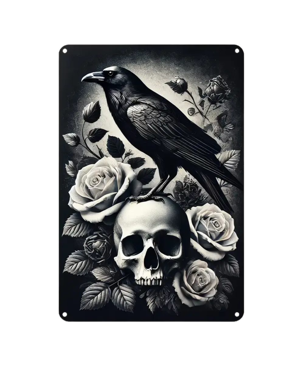 Bring dark elegance to your decor with the Gothic Black Crow & Skull Tin Sign. Featuring a hauntingly beautiful design of a black crow perched atop a skull, this sign captures the perfect mix of mystery and gothic artistry. Crafted from durable tin with a weathered, vintage finish, it adds bold character to any wall. Ideal for gothic-themed rooms, studios, or collectors of dark art.