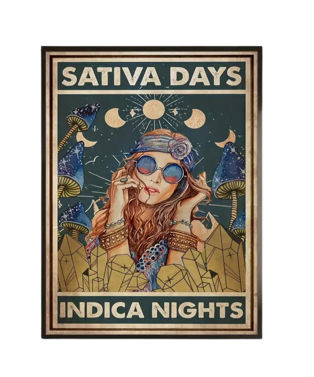 Introducing our "Sativa Days Indica Nights" Canvas Retro Poster – a stylish and nostalgic piece of art that celebrates the cannabis lifestyle. Crafted on high-quality canvas with a retro-inspired design, this poster captures the essence of carefree days and relaxed evenings.