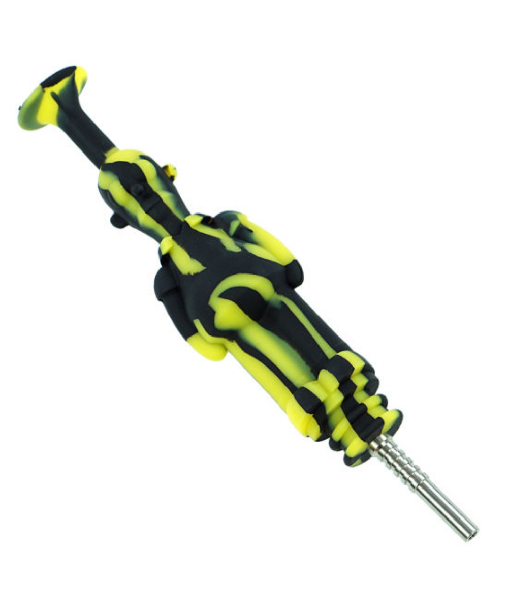 This Silicone Homie Nectar Collector stands 9" tall and is made of food grade silicone. It includes a titanium tip and comes apart for easy cleaning.