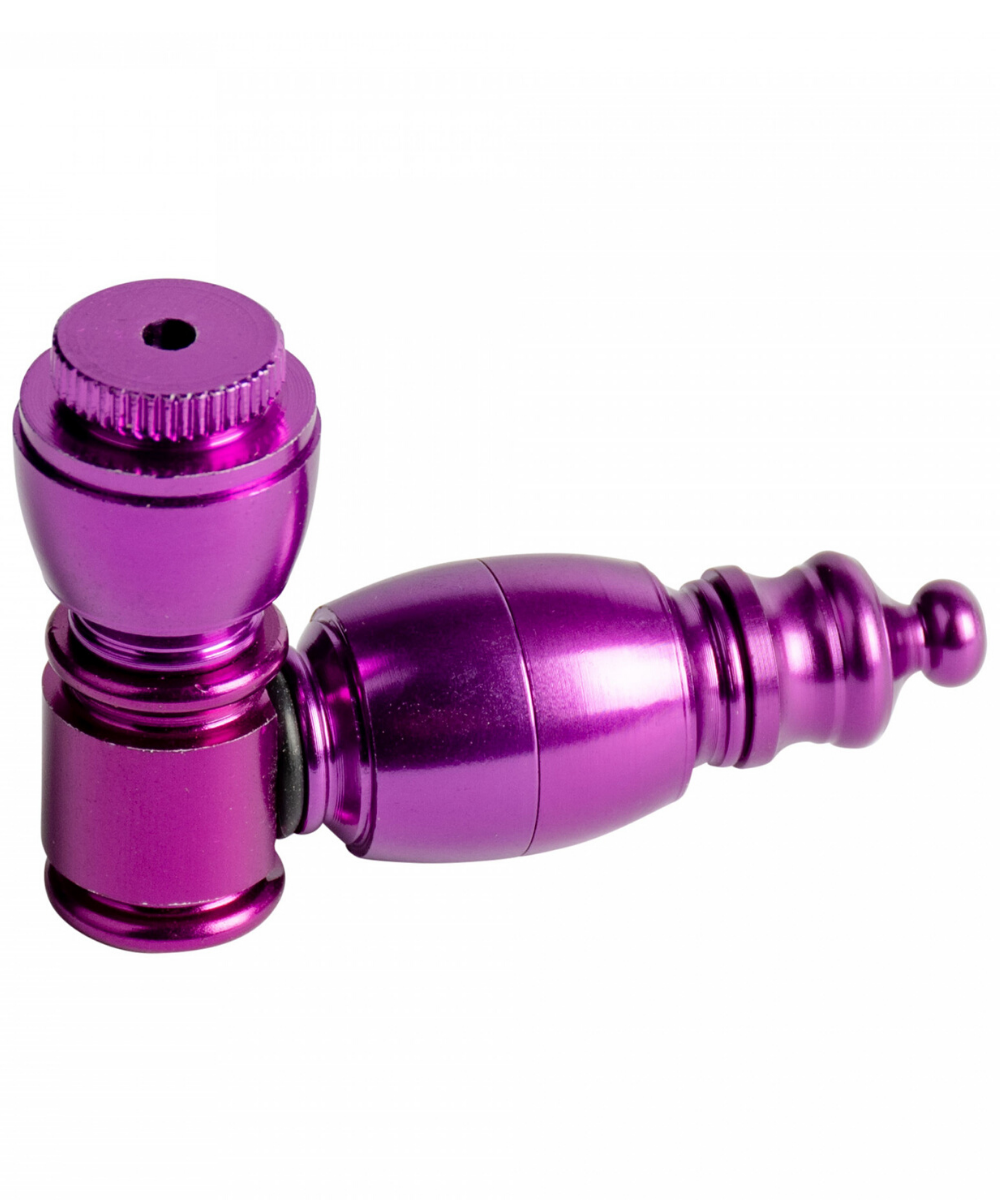 A coloured anodized metal hand pipe with an acrylic chamber.  Approximately 2.5" in length.  This pipe also includes a carb cap; easily pack your pipe for later and light right through the cap!
