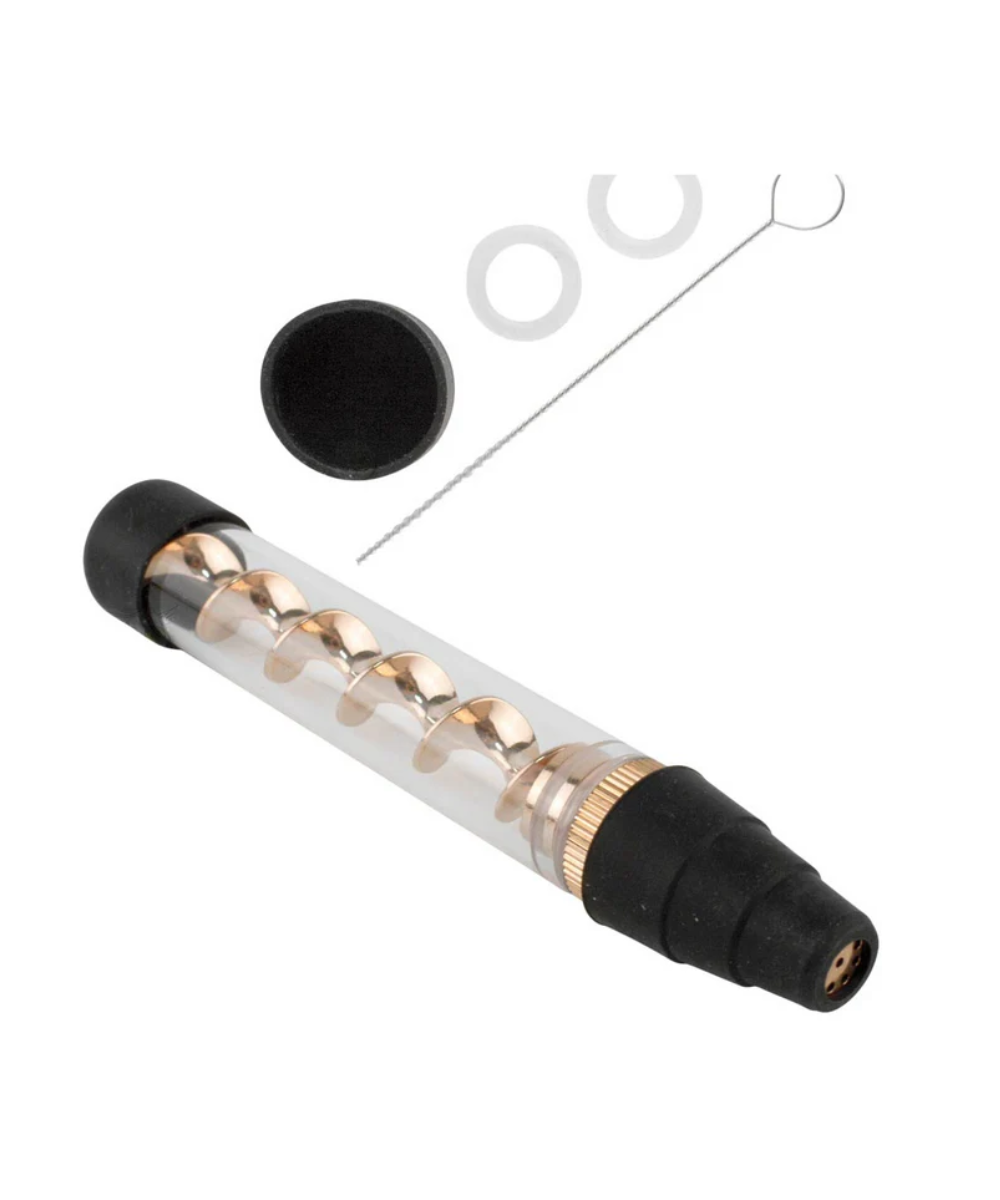 A quartz and metal Twisty Blunt with special 14mm connection to connect to your waterpipe for a huge twisty bowl! This device is loaded with herbal material and through a simple 'twist' the metal spiral can move the herbal material to the fore front of the pipe while expelling the used ash.